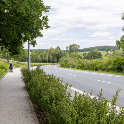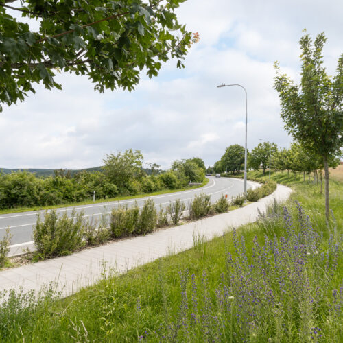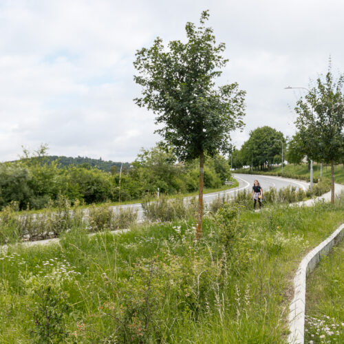 Vegetační úpravy podél pěší komunikace dotváří prostor s ohledem na přírodní podmínky, na ekologickou hodnotu přilehlé přírodní památky a v neposlední řadě na bezpečný pohyb chodců.