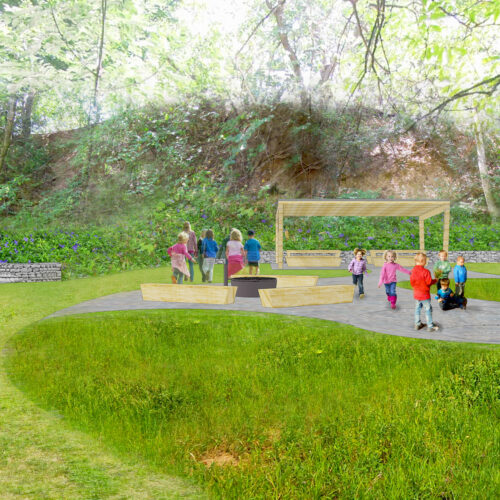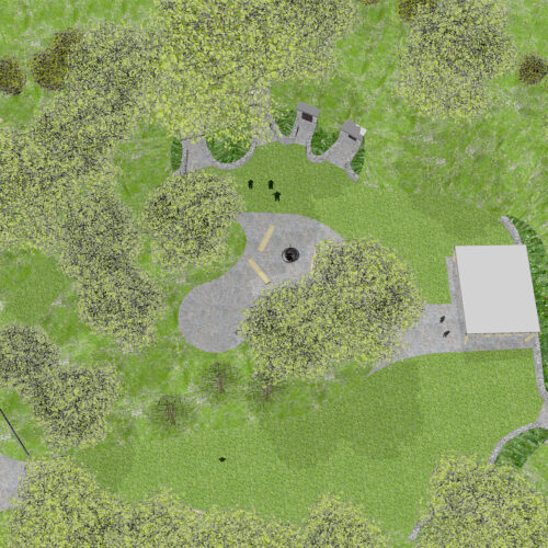 Vstup do lomu je vydlážděný kamennou protravněnou dlažbou. U vstupu je navržený zahrazující plůtek s nápisem „HLINÍK“. V prostoru lomu je pak navržena plocha s grilovištěm, vodním prvkem a posezením.