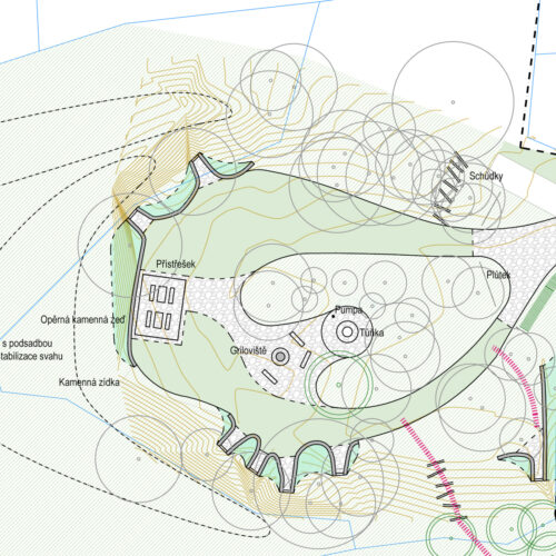 Návrh počítá s vyčištěním prostoru od náletových dřevin. Vstupy do sklípků jsou zpevněny na sucho skládanými kamennými zídkami. Svahy kolem kamenných zídek budou porostlé půdopokryvnými rostlinami (např. břečťan, barvínek).