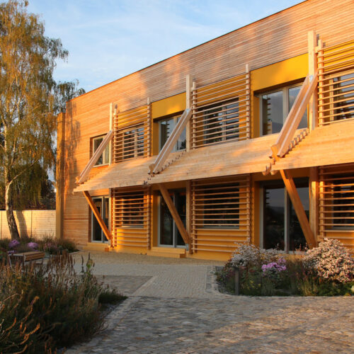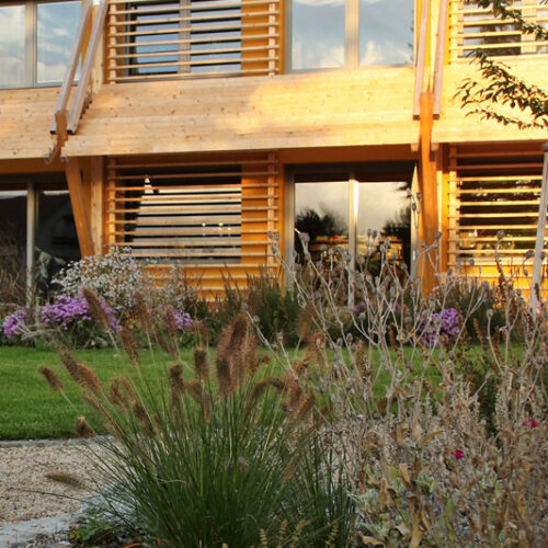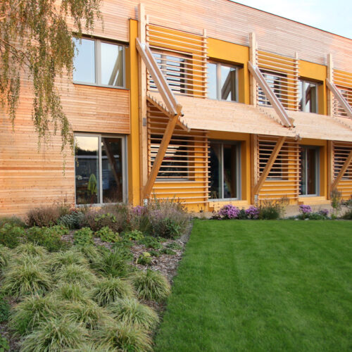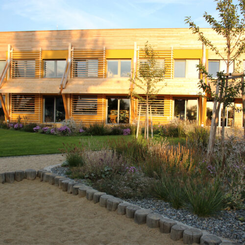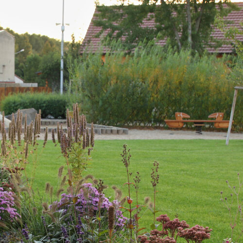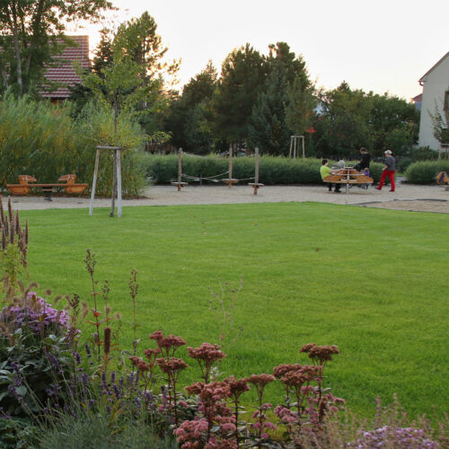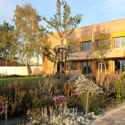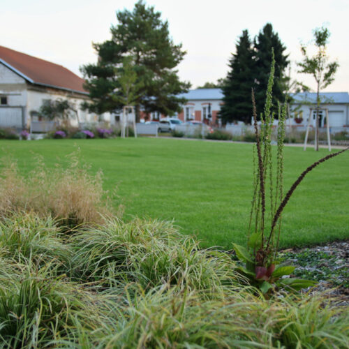 Cílem bylo vytvořit prostor, který bude sloužit jak zaměstnancům firmy, tak i dětem ze sousedství. U vstupu do firmy je navržená odpočinková plocha, která je odcloněna pomocí záhonové výsadby. Do protilehlé plochy je umístěno dětské hřiště s herními prvky a s vrbovými stavbičkami. Mezi těmito prostory je ponechána rozlehlá trávníková plocha, která je vymezena obvodový záhony. Dětské hřiště je pak odstíněno od komunikace živým keřovým plotem (vrba nachová) a výsadbou alejových stromů (javor babyka).
