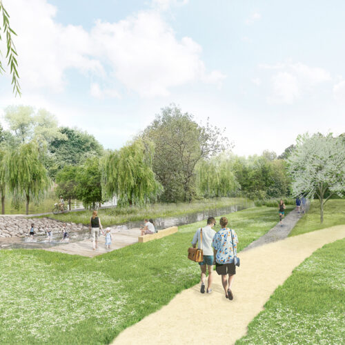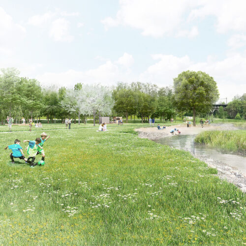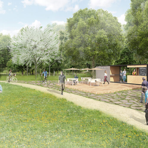Zásadní je umístění kiosku s pobytovou terasou nabízející posezení pod stromy v návaznosti na pobytovou louku u vody. V souvislosti s kioskem jsou navržena vizuálně provázaná odpočinková místa – pod stromy a u vody. Místo pod stromy má sloužit jako herní plocha pro děti s dřevěnými prvky a pískovou plochou. Místo u vody je pojednáno jako říční pláž.