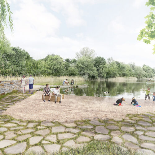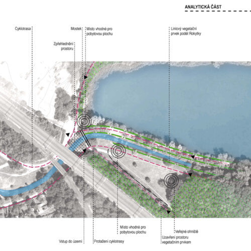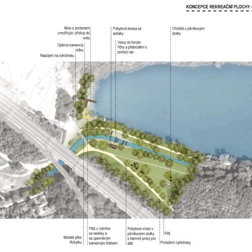 Na pobytové louce je podél aleje navrženo přírodní hřiště s posezením u piknikových stolů. Záchytným bodem na svahu u Rokytky je dřevěná paluba se sedákem. Zásadním momentem návrhu je využití břehu rybníka k rekreaci. U vodní plochy je pak navržena písečná pláž s dřevěnými sedáky. Podél hrany svahu je umístěna opěrná kamenná zídka oddělující bujnou pobřežní vegetaci od odpočinkového místa. Pod zídkou je navrženo molo, na nějž navazuje ponton.