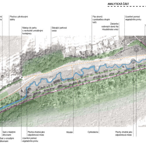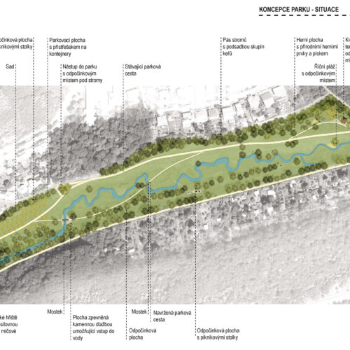 Cílem bylo navrhnout další rozvoj parku. Definovali jsme tedy hodnoty území, a to charakter území říční nivy a usazení parku mezi zalesněnými svahy. Hodnotná je i přítomnost vegetačních prvků (sad, břehové porosty, stromořadí, vzrostlé stromy) a technických prvků (viadukt a železnice). Jako problematické jsme vyhodnotili nesourodost ploch, nedostatečné propojení zpevněnými plochami, nejasné nástupy do území, chybějící programová náplň, mobiliář a pobytové plochy.